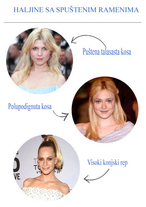 Ako Vam nije prijatno što su Vam ramena, vrat i ključna kost previše vidljivi onda uz haljinu bez ramena nosite puštenu kosu koja se prirodno u talasima spušta niz ramena i na taj način ih vizuelno prikriva. Još jedan način da se u haljini bez bratela osećate kao princeza jeste da nosite polupodignutu kosu. Gornji deo kose sklonite sa lica pozadi i pričvrstite šnalama, a donji deo slobodno pustite da pada niz ramena. Ako zaista želite da dekolte bude u centru pažnje onda vežite visoki konjski rep na vrh glave, a gumicu obavijte pramenom kose da biste je prikrili.
